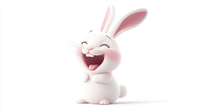 A cute white cartoon rabbit laughing with its mouth open and tongue sticking out.