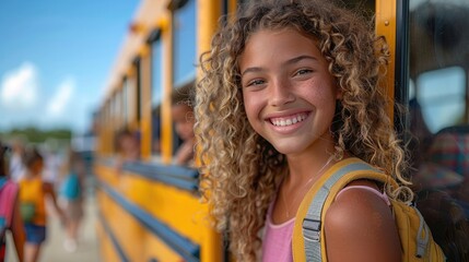 A happy girl with curly hair wearing yellow backpack and standing in the door of an American school bus smiling at the camera .