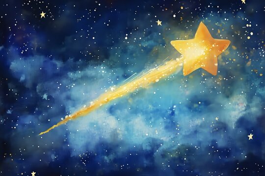 A vibrant, watercolor illustration of a shooting star with a golden tail, evoking a sense of wonder and magic in the night sky