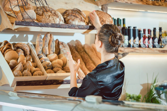 Smiling Shop Assistant With Bread In Organic Grocery Store Images