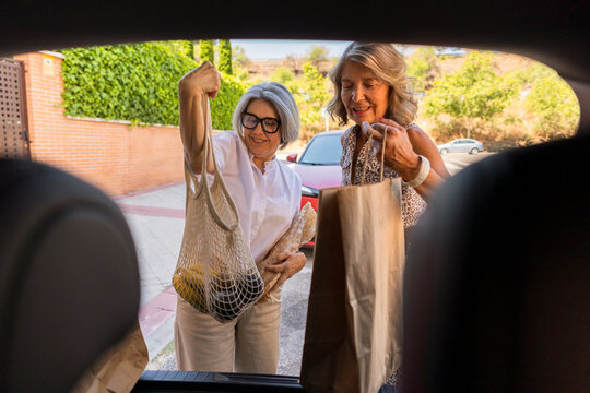 A volunteer carrying a cardboard box filled with groceries. Generative AI