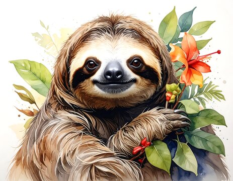 A smiling sloth amidst lush tropical foliage, rendered in a watercolor style