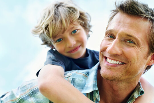 Father, son and portrait or happy with piggyback for bonding, relationship and freedom with blue sky in nature. Family, man and boy child with playing, care and love for excitement, peace and support