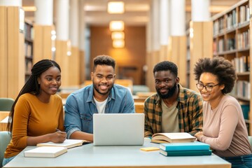 Diverse students collaborating on a project in an academic library, using a laptop and discussing study topics. (Education)