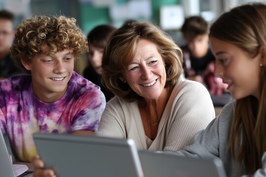 Teacher assisting teenage students with laptops in classroom. Modern education, technology learning, teamwork, mentorship, and positive interaction for school or e-learning concepts.