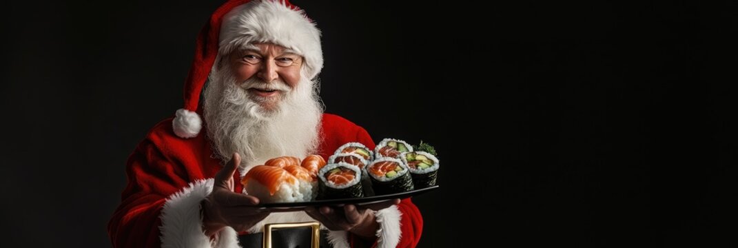 Cheerful Santa Claus, with a twinkling smile and white beard, holds a platter brimming with sushi rolls, set against a lively black background.