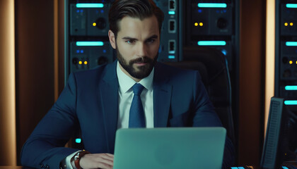 Bearded smiling system administrator is working with server rack and telecommunication equipments in data center