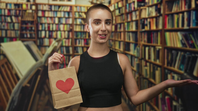 Young woman smiling holding a paper bag with red heart and presenting palm in library building; gift giving joy.