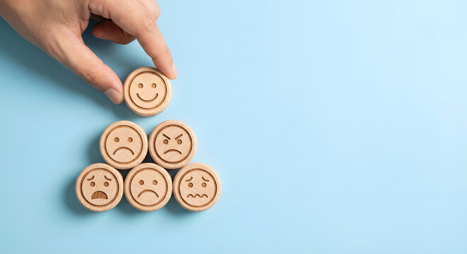 Hand placing wooden tokens with smiley faces on a blue background, illustrating emotional expressions and feedback, showcasing the importance of sentiment analysis in communication