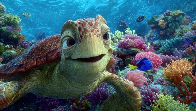 Joyful underwater sea turtle swims amongst coral reef and fish