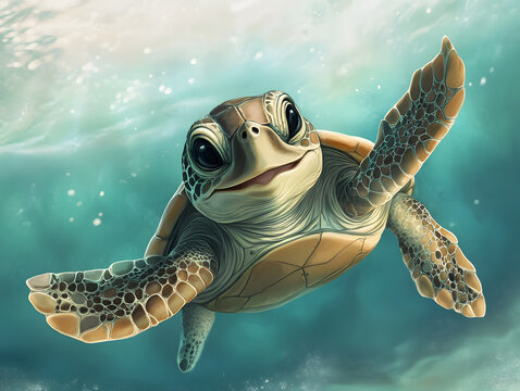 Smiling baby turtle swim under water illustration