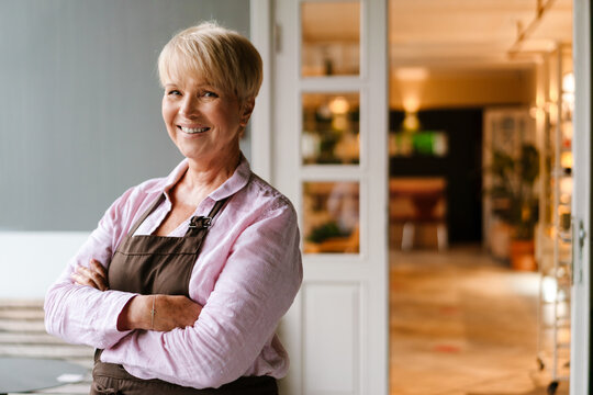 Portrait of smiling waitress in apron looking at camera