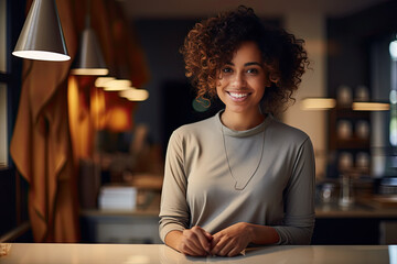 Confident young waitress with curly hair smiles behind a trendy bar in a bustling restaurant at night, embodying small business pride and exceptional service