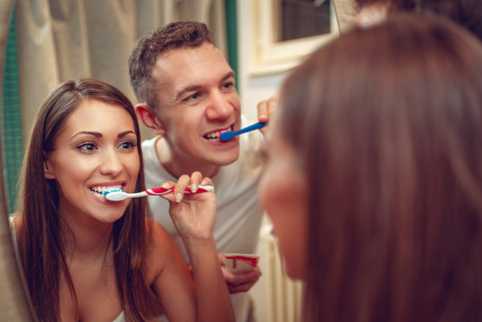 Couple brushing teeth together in bright bathroom, enjoying morning routine and each other's company