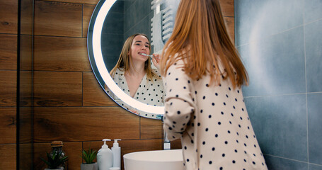 A cheerful woman happily enjoying her morning routine while brushing her teeth in front of the bathroom mirror
