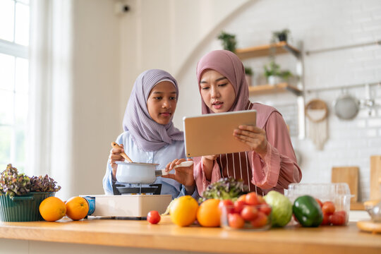 Muslim girl cooking with woman using tablet for recipe, halal food learning with technology, warm islamic family lifestyle, digital nutrition education for muslim kid, modern halal kitchen inspiration