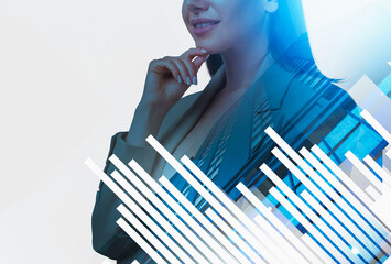 A confident woman in a suit smiling with hand near chin, overlaid with city buildings and abstract bar graphics on a white background, symbolizing business concept