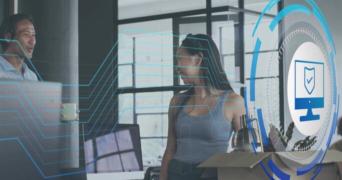 Talking woman wearing sleeveless top and trousers in office bay, with monitors and security overlay