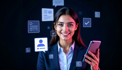 Smiling businesswoman holding smartphone, surrounded by digital icons, symbolizing online engagement and networking. Represents modern digital communication, technology interaction.