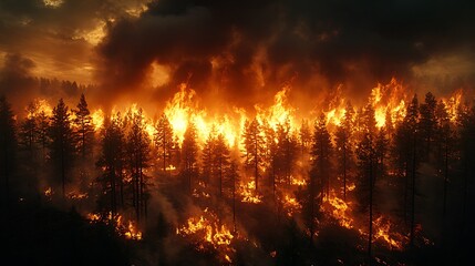 Massive wildfire spreading through dry forest with heavy smoke clouds and orange flames.