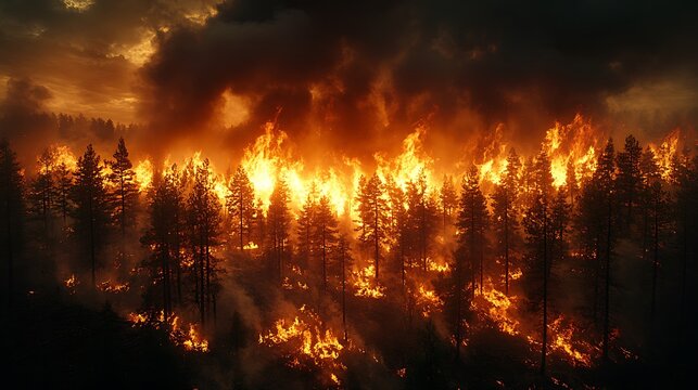 Forest wildfire spreading across hillside with intense flames and smoke