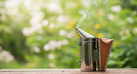 Bee smoker on the grass in apiary garden copyspace nature natural peaceful beekeeping equipment technology working honeycraft concept.