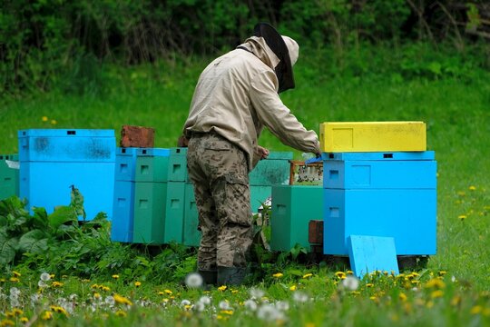 Frames of a bee hive. Beekeeper harvesting honey. The bee smoker is used to calm bees before frame removal. Beekeeper Inspecting Bee Hive.