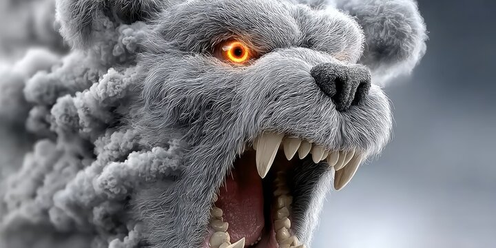 Alien creature emerges from flames with glowing eyes in a dramatic setting
