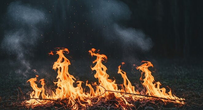 Dramatic bonfire flames rising into dark night sky bright orange fire and sparks