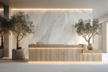 Minimalist office with filing cabinet and vertical poster frame on smooth marble floor.