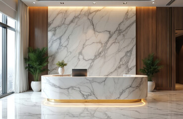 Doctor leaning at reception desk speaking with front desk staff in modern medical clinic