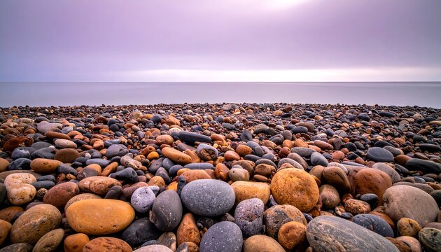 Serene beach landscape with smooth colorful pebbles and distant mountains under a cloudy sky