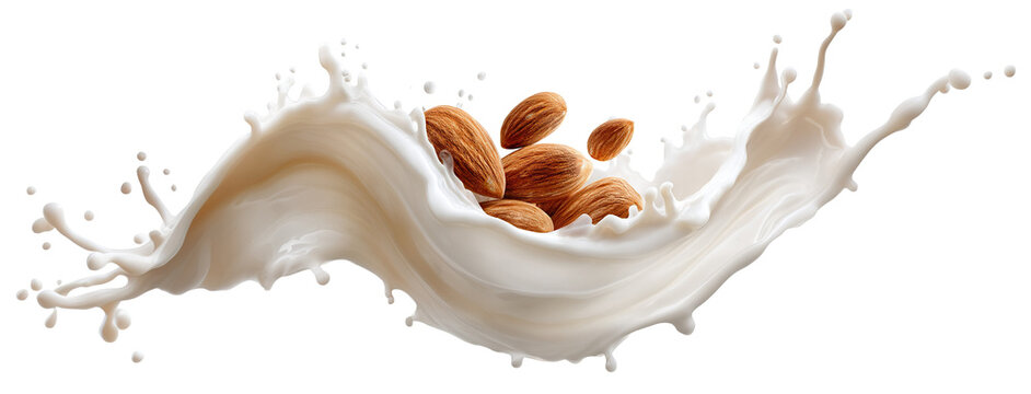 Almond nuts splashing in creamy milk wave, isolated on transparent cutout background