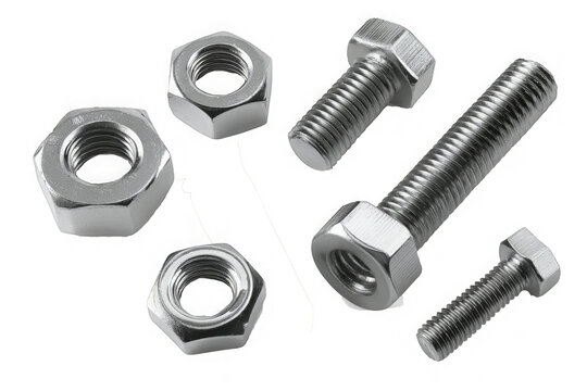 A collection of various metallic bolts and nuts with threaded designs on transparent background.