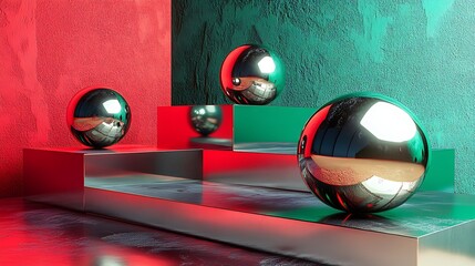 Patterned cubic grid featuring dotted faces, iridescent gradients and metallic spheres