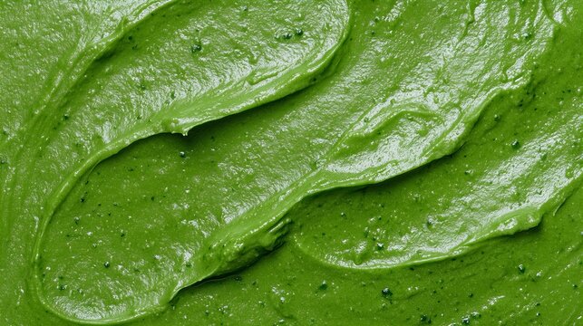 Close-up view of vibrant green matcha paste, its smooth texture and swirling patterns highlighted.