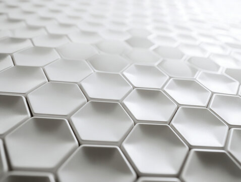 Abstract pattern of smooth white hexagonal tiles creating a modern geometric textured surface with soft lighting and subtle shadows in a minimalist design