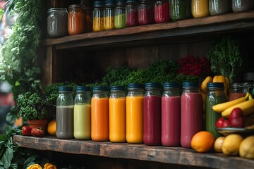 Three glass bottles of fresh fruit juice in vibrant colors - orange, red, and purple - against a colorful background, illuminated by sunlight. Perfect for juice bars, tourism, and summer promotions.