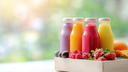 colorful smoothie bottles with fresh fruits in delivery box, blurred bright table background, soft natural lighting, clean modern composition