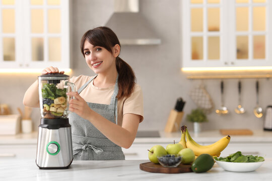 Woman preparing healthy fresh fruit smoothie in modern kitchen