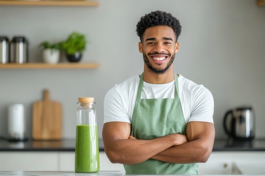 Fitness motivation drives exercise and self-improvement. Smiling man in an apron with a green smoothie in the kitchen.
