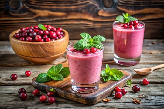 Refreshing cranberry smoothies garnished with fresh mint on a rustic wooden surface