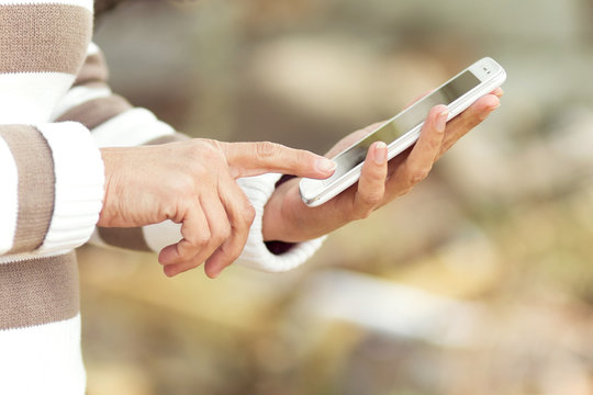 Texting sms with phone in city outdoor park. Woman sending text message with cellphone. Chatting on instant messaging app. Person using smartphone. Conversation and discussion with friend online.