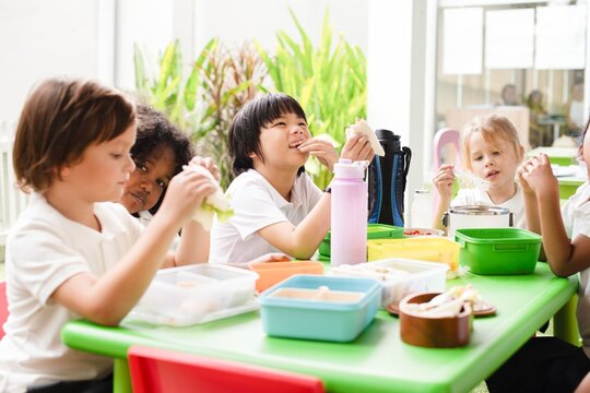 Children enjoying lunch at a green table, eating sandwiches and snacks. Kids in a bright room, sharing a meal, smiling and having fun together. Diverse young students eating school lunch.