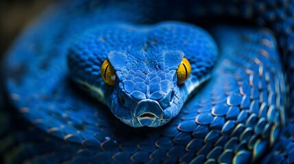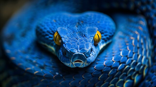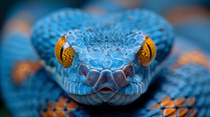 Blue viper snake closeup face. Dangerous animal snake closeup