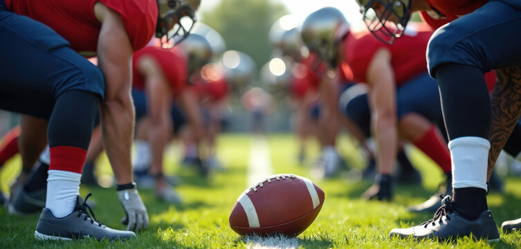 Plentiful copy space image of a football on a lush American Football field with a yard marker