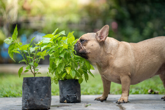 Cute domestic Bulldog sniffing potted plants in a backyard