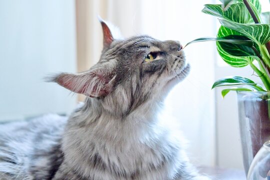 Close-up of cat sniffing and biting green houseplant