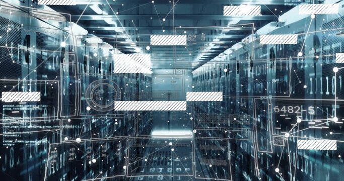 Displaying server racks lining data center corridor, with LED panels, network cables and overlays