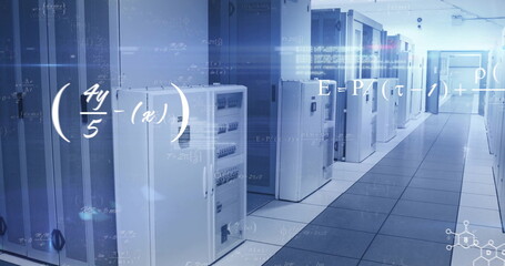 Displaying server racks in glass-doored cabinets lining data center corridor, with digital overlays